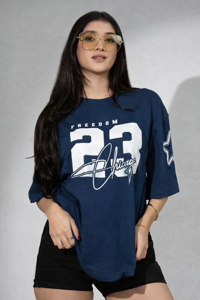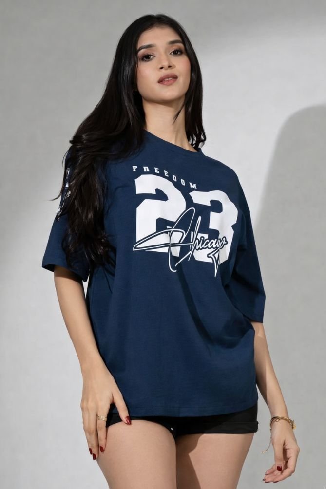The standout Freedom 23 Chicago graphic adds a sporty varsity aesthetic, making this Chicago Oversized Tee for Women perfect for casual outings, college wear, travel days, or athleisure looks. Pair it with shorts, joggers, or sneakers to achieve an effortless urban vibe.